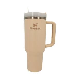 Stylish Stanley travel mug in fuchsia with teal handle. Durable design with secure lid.