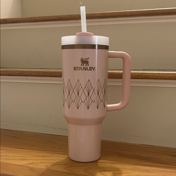 Stylish Stanley tumbler with geometric design. Features a sturdy handle and straw. Perfect for any beverage.