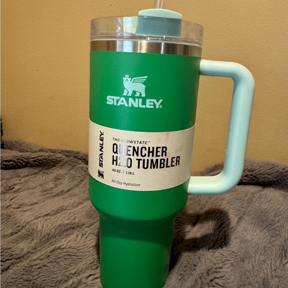 Durable Stanley tumbler in bold green. Ideal for daily hydration.