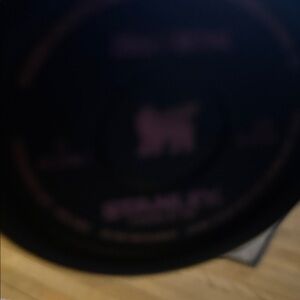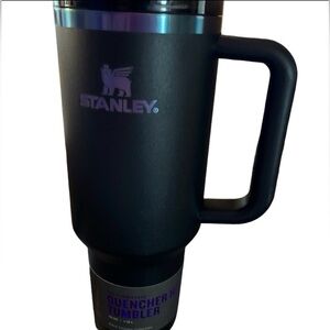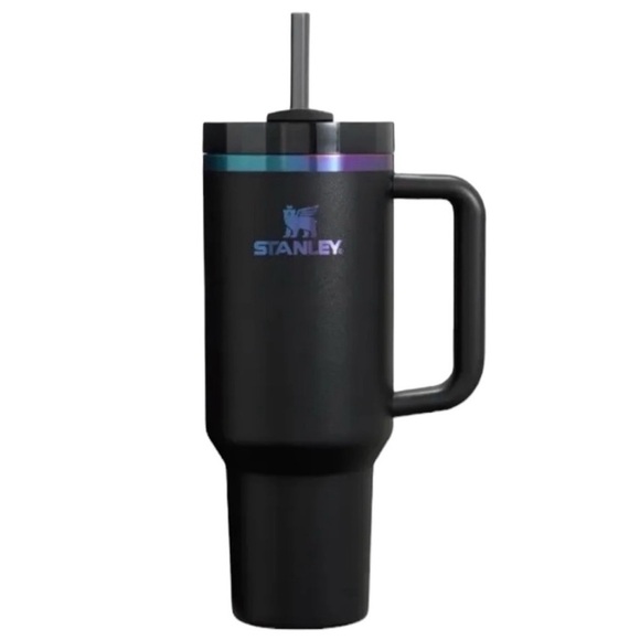 Stylish black Stanley travel mug. Features iridescent accents and a convenient handle. Includes a matching straw.