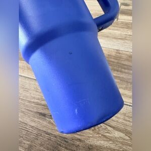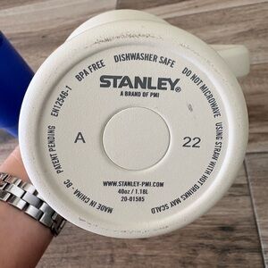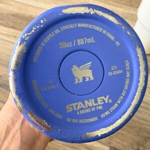 The 30 ounce Iris Stanley has several surface scratches as shown in photo. Also had a sticker on the front underneath the logo and there is some residue left behind, as shown in photos. The cream Stanley is a 40 ounce and does not include a lid.