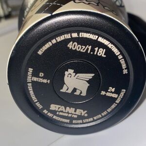 Stanley tumbler with a fun cartoon design. Features gray and black colors.