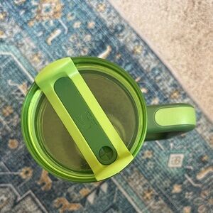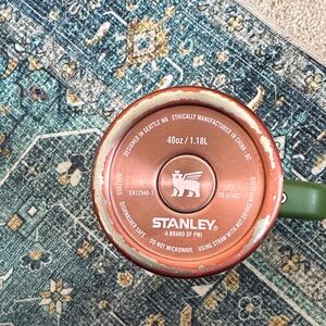 Durable Stanley mug with metallic copper body. Olive green lid and handle. Ideal for travel.