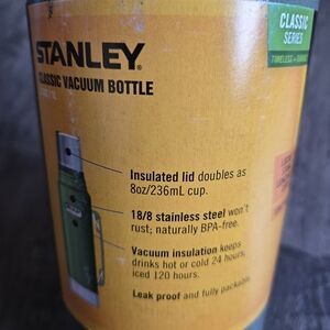 Robust Stanley vacuum bottle. Keeps beverages hot or cold for hours. Iconic design with sturdy handle. 1.1 quart capacity.