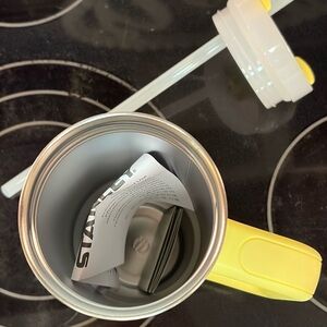 Bright yellow Stanley tumbler with handle. Keeps drinks at ideal temperature. Perfect for home or travel.