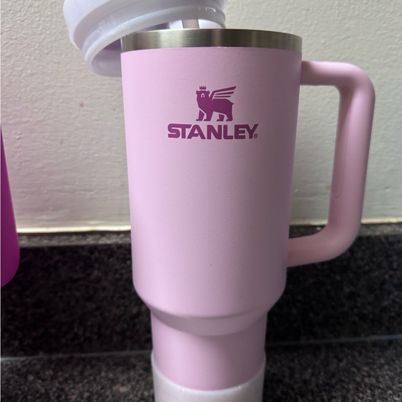 Elegant light pink travel mug by Stanley. Comes with a durable handle and a secure lid.