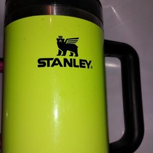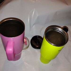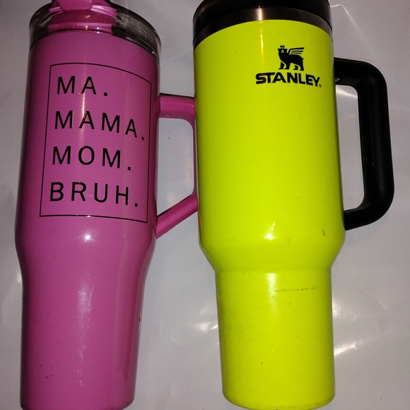Set of two Stanley travel mugs and pink mom travel One pink with text. One bright yellow with black handle.