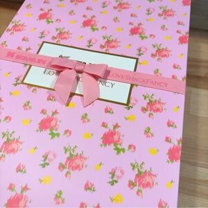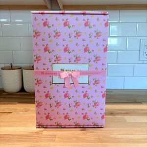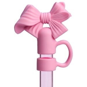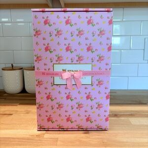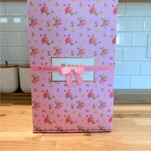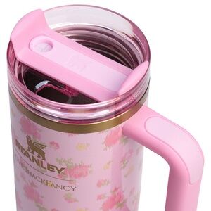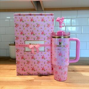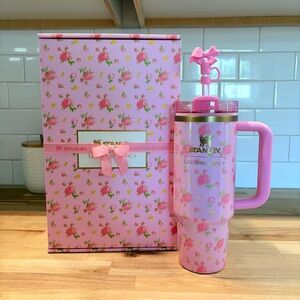Charming Stanley LoveShackFancy mug with pink floral pattern. Includes a unique bow-shaped straw topper.