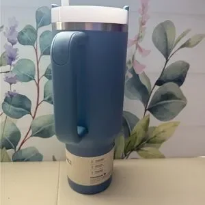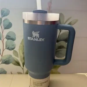 Stanley Quencher H2.0 Tumbler in blue. Features a sturdy handle and straw lid.