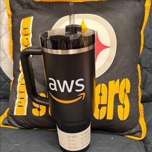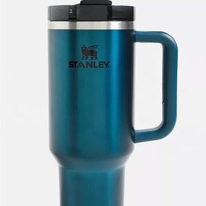 Stylish metallic gold tumbler by Stanley. Features a convenient handle. Ideal for all beverages. Brand new in box.
