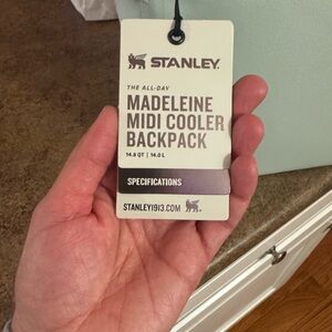 Compact Stanley cooler backpack. Light gray with yellow details. Ideal for daily adventures.