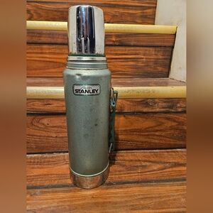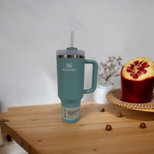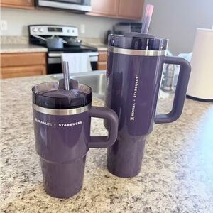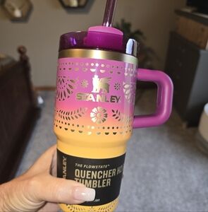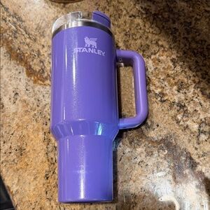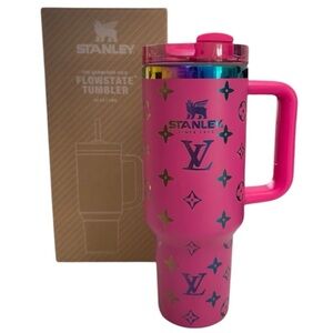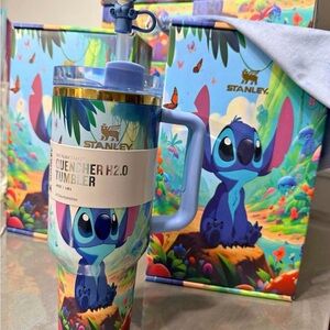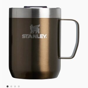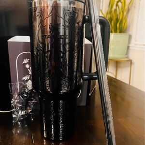 Elegant black Stanley tumbler. Features a celestial theme with stars and moon. Includes a sturdy handle.