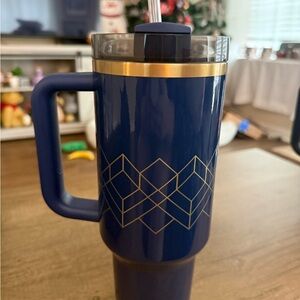 Stylish navy mug with gold geometric design. Perfect for drinks on the go.