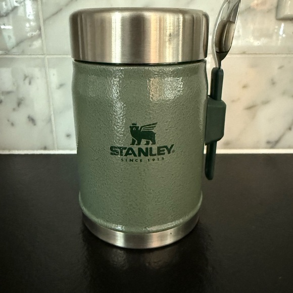Olive green Stanley jar with stainless steel lid. Includes attached spoon for convenience.