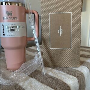 Never used Stanley 40oz tumbler sold as is. Features a pink handle, clear lid, and unique custom floral boot detail around the base. Vacuum insulated cup made from 90% recycled stainless steel.