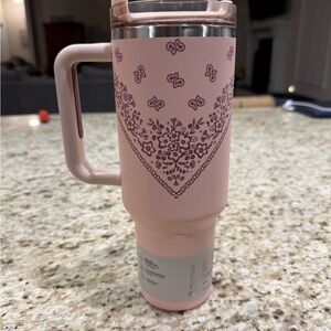 Charming pink mug with floral design. Durable and insulated for hot or cold drinks. Ideal for home dining.
