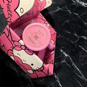 Charming Stanley tumbler with Hello Kitty design. Includes a heart-shaped straw topper. Delightful pink hue.