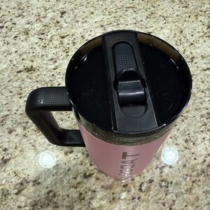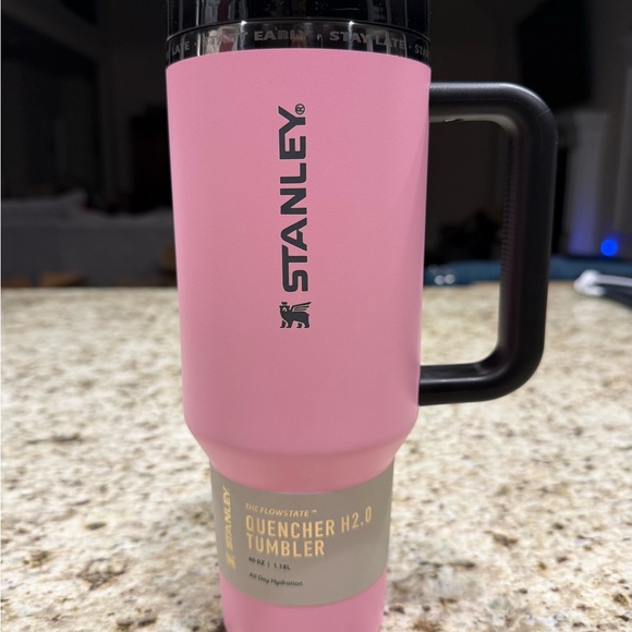 Stylish pink tumbler by Stanley. Features a durable handle and modern design.