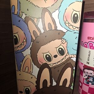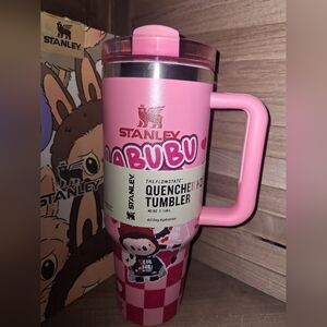 Stanley Quencher tumbler in vibrant pink. Features a playful Labubu design and sturdy handle.