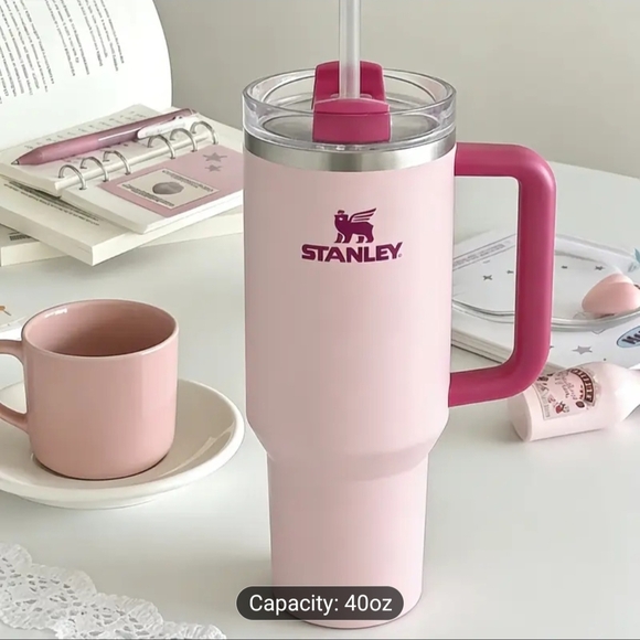 Stylish pink Stanley travel mug. Comes with a clear lid and straw. Convenient handle for easy carrying.