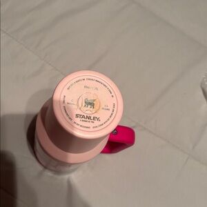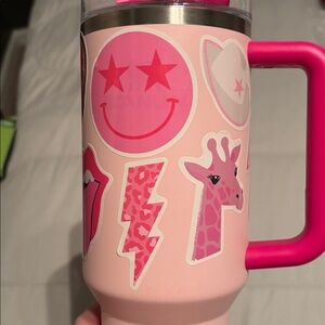 Stylish pink travel mug with fun graphics. Features a sturdy handle for easy carrying. Perfect for drinks on the go.
