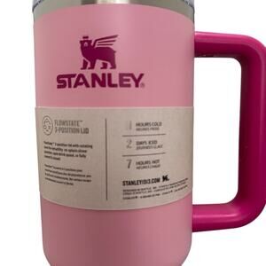 Durable Stanley tumbler. Pink with a sturdy handle. Ideal for hot or cold drinks.