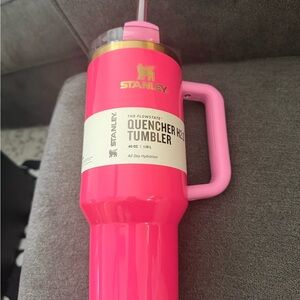 Vibrant pink Stanley tumbler with a sturdy handle. Features a secure lid and straw.