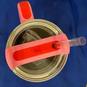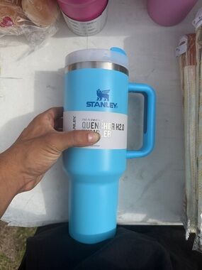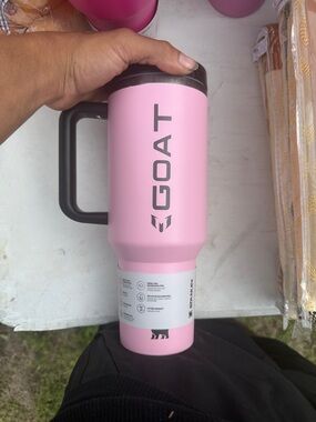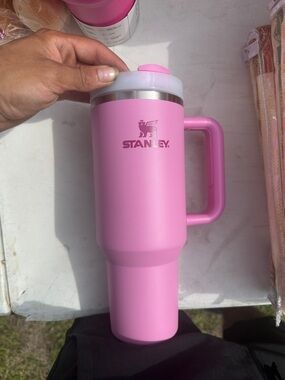 Charming pink Stanley mug with a heart design. Ideal for beverages.