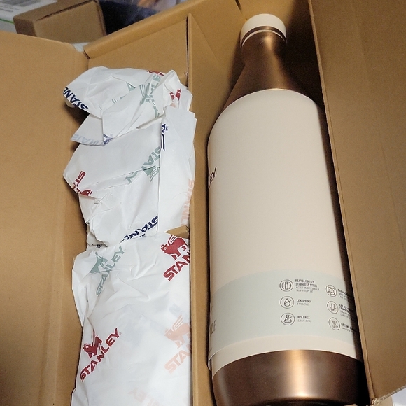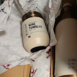 Stylish Stanley thermos in pink/bronze 34oz and 2 10oz wine/beverage. Brand new in original box. Never been used. ideal for camping or roadtrips.