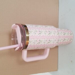 Chic Stanley tumbler featuring a pink floral pattern. Includes a matching straw and sturdy handle.
