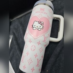 Charming Stanley mug with Hello Kitty design. Features pink heart and white accents.