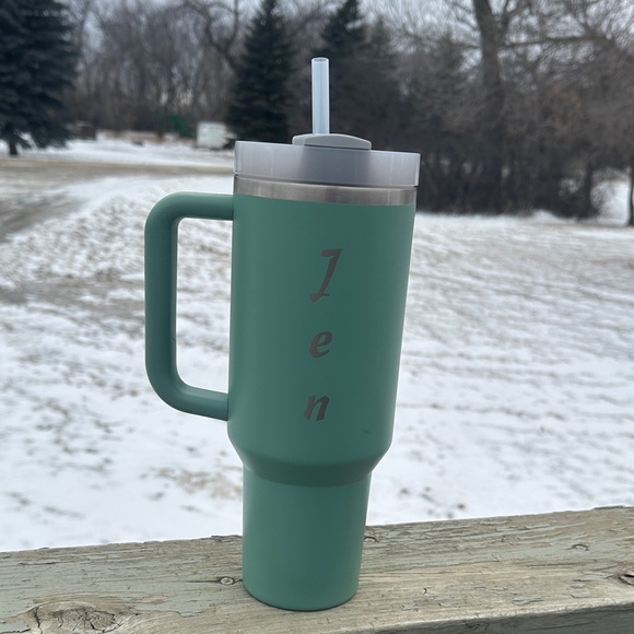 Hey Jen! Enjoy your favorite beverages in style with this green “eucalyptus” colored insulated tumbler. Perfect for keeping drinks hot or cold, it features a convenient straw for easy sipping. Excellent gift for the Jen in your life!