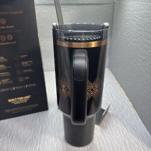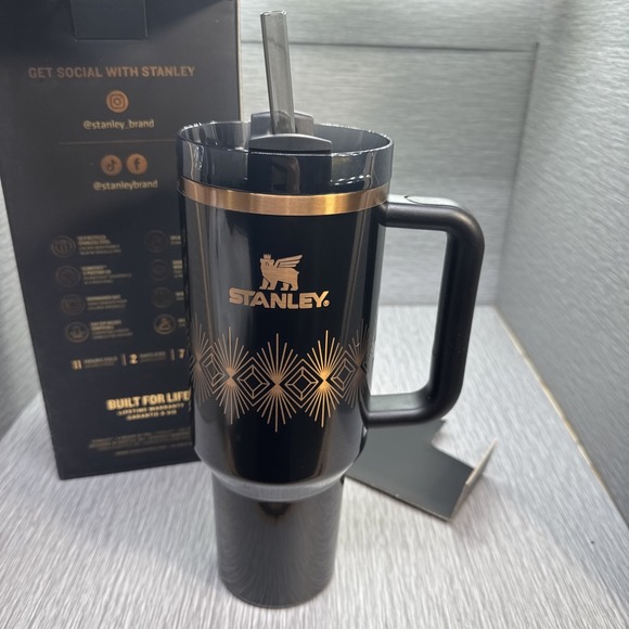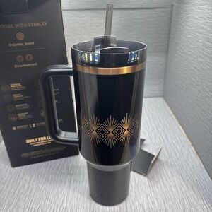 Brand new Stanley Quencher H2.0 FlowState tumbler from the Deco Collection in a striking Black Gloss finish with gold accents. This 40oz insulated tumbler features Stanley's popular FlowState rotating lid, reusable straw, and a sturdy handle for easy everyday use.