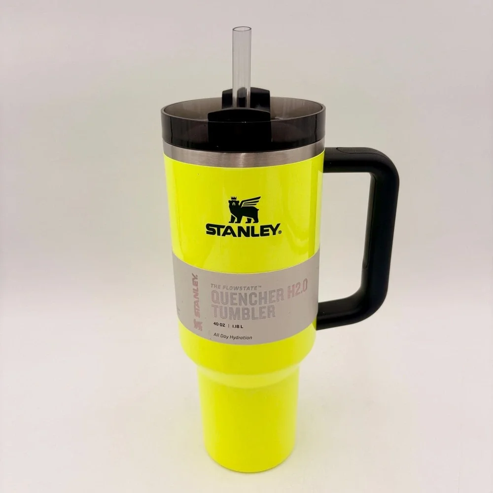 Stanley Adventure Quencher H2.0 FlowState tumbler in a vibrant Electric Yellow neon finish provides exceptional insulation for all-day hydration. This 40oz vessel features double-wall vacuum insulation to keep drinks cold for hours, paired with a versatile FlowState 3-position lid that includes a reusable straw, a wide opening for chugging, and a full-cover top to prevent splashes. Designed with a comfort-grip handle and a tapered base that fits most car cup holders, it is constructed from recycled stainless steel for a sustainable yet durable design.