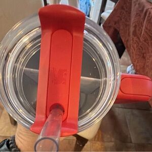 Bright pink Stanley tumbler lid. Stylish and durable design.