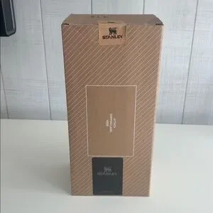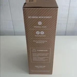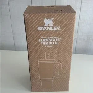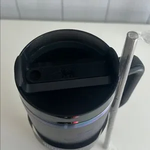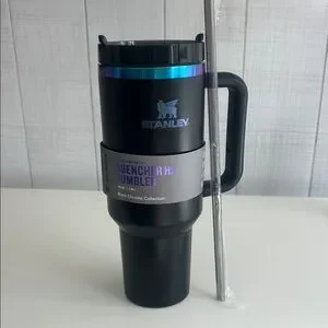 Stylish Stanley tumbler in black with an iridescent lid. Includes a durable handle and straw.