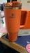 Bold orange Stanley tumbler with handle. Ideal for on-the-go hydration.