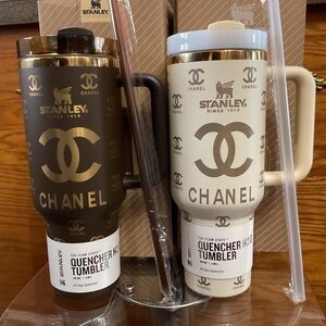 Stylish Stanley tumbler with flip straw. Features elegant brown and gold design.