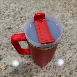 Red Stanley tumbler with Hello Kitty custom design. Durable and stylish. Perfect for drinks on the go.