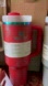 Stylish Stanley tumblers in red and gray. Features convenient handles for easy carrying.