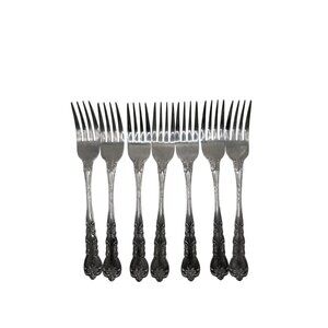 Once upon a time, in the world of fine dining, a set of exquisite forks was crafted by Stanley Roberts. These forks, adorned with delightful floral and scroll designs, bring elegance to any table. Their stainless steel composition ensures durability, while the intricate patterns add a touch of sophistication. Whether hosting a grand feast or an intimate dinner, these forks are a timeless choice. Will require additional cleaning by buyer. Some corrosion and dirt.