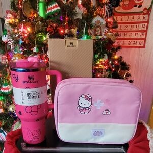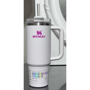 Elegant Stanley tumbler in metallic finish. Features a pink handle and straw.