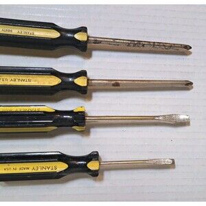 Please see all the photos for the condition. Pre-owned, lot of 4 Stanley screwdrivers. Includes 2 philips and 2 slotted. Used condition.