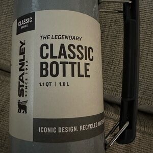 Durable Stanley thermos in silver and gray. Keeps drinks hot or cold. Ideal for travel and outdoor use.