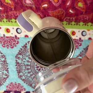 Stylish and durable travel mug. Speckled cream design with a sturdy handle. Ideal for hot or cold drinks.