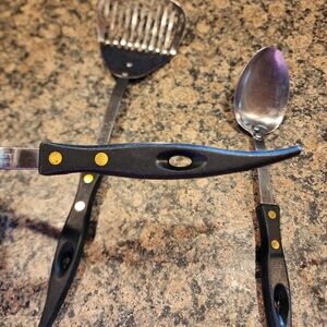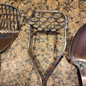 Set of three Stanley utensils. Includes a slotted spatula, masher, and spoon. Perfect for cooking and serving. The masher does have a broken/missing piece, I'm assuming, from heat while resting on a pan. Otherwise, they are in great shape. Stainless steel, made in USA.
