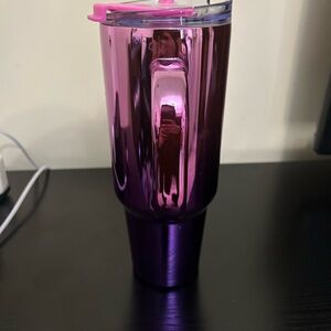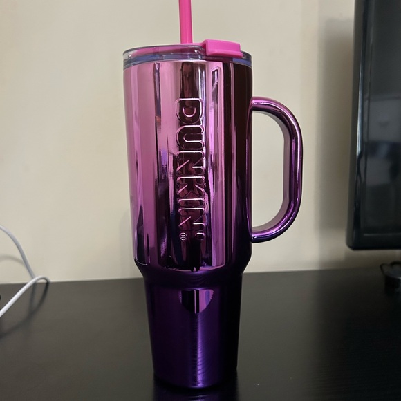 Dunkin' tumbler in a shiny pink and purple finish with a pink straw.