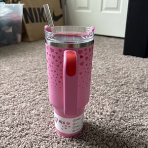 The Stanley Target Exclusive Valentines Day 2025 Sweet Hearts 40oz Tumbler is a stylish and functional drinkware item perfect for both hot and cold beverages. This tumbler features a pink color with a hearts pattern, making it a cute and festive choice for Valentine's Day. It is made of stainless steel and can keep drinks cold for 12 hours and hot for 8 hours, thanks to its insulated design. It comes with a drink-through lid and a straw, making it convenient for on-the-go use. This tumbler is a must-have for teens, adults, girls, and kids alike who want to enjoy their favorite drinks in style.