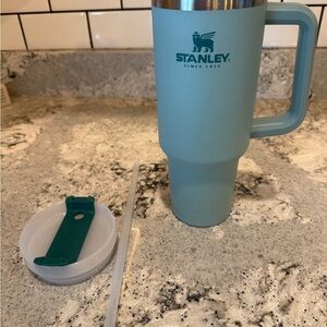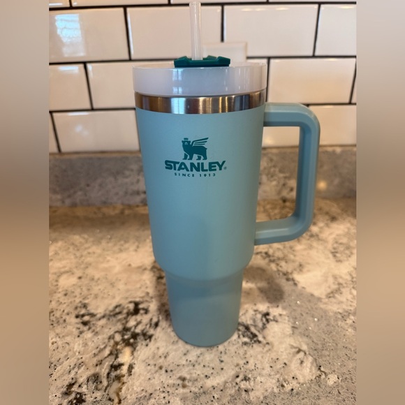 Stylish Stanley mug in teal. Features a sturdy handle and insulated design. Ideal for hot or cold drinks.