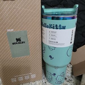 Charming Stanley tumbler in teal with Hello Kitty graphics. Ideal for keeping drinks cold or hot.